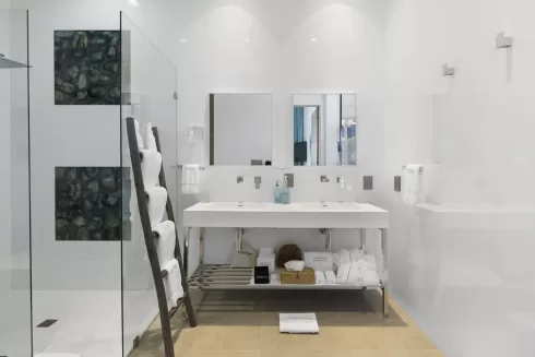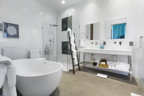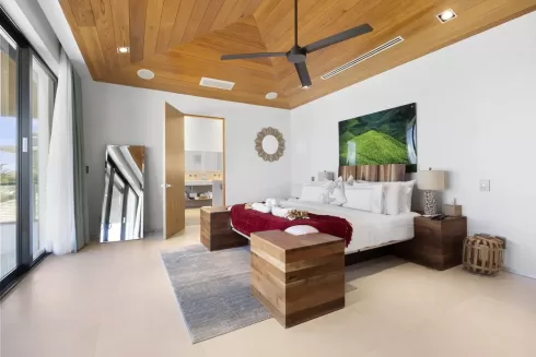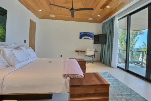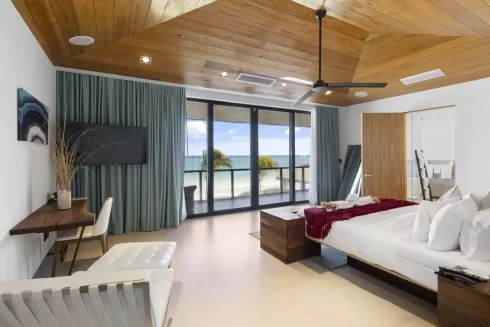 To the right of the room is the modern kitchen and a second suite that overlooks the ocean. To the left are three more suites : the third suite which also overlooks the ocean and at the front of the house are suites four and five which have private balconies.