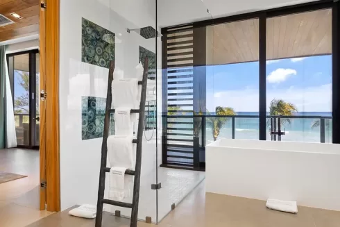 The Asian House offers a serene island escape with a private gym, sauna, steam room, massage room, and a cozy home theater for entertainment. It also includes a separate two-bedroom apartment for added privacy. Outside, guests can enjoy a heated pool, jacuzzi, and outdoor Tiki hut kitchen. The property opens onto a semi-private pink-sand beach, complete with a shaded cabana and a variety of water sports equipment for relaxing or exploring the turquoise waters.