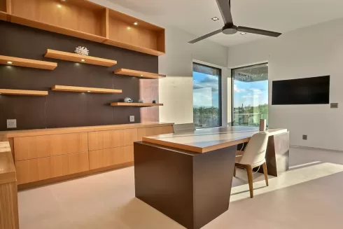 The top floor is accessible from the main floor by way of a magnificently designed floating staircase. On this floor you will find a home office and a master suite, the house’s largest bedroom. This spacious suite faces east and has a private balcony with sweeping ocean views. The oversized, freestanding bathtub and separate shower located in the ensuite bathroom also have direct ocean views. The office is located next to the master suite.